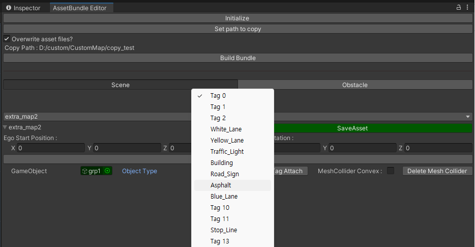 4, GameObject의 Tag0 드롭다운 리스트를 클릭하여 추가한 도로 메쉬 (.obj)의 meterial 에 해당하는 태그 값을 선택한다.