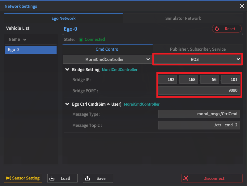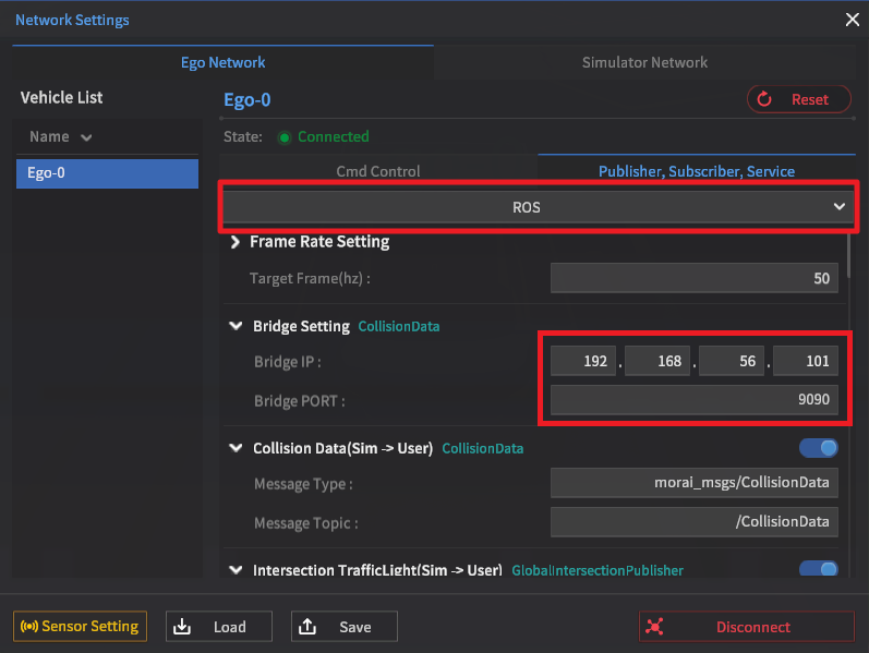 시뮬레이터 네트워크의 ROS 통신 설정은 네트워크 설정 UI | Simulator-네트워크-설정 를 참고하여 아래와 같이 진행한다.
