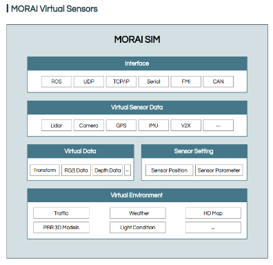 MORAI SIM: Drive에서는 차량의 복잡한 물리적 특성을 반영한 차량 및 센서 모델 뿐만 아니라 날씨, 조도, 장애물에 따른 주행 환경과 유사한 디지털 트윈, 실제 도로에서 검증하기 어려운 테스트 시나리오 모두 풀스택으로 제공한다.