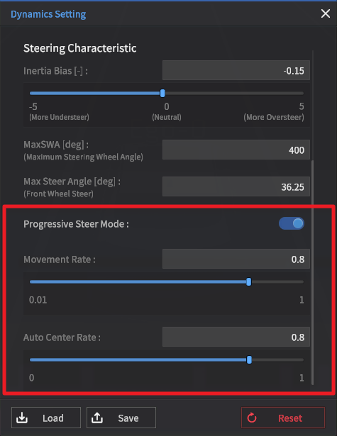 Progressive Steer Mode의 변수인 Movement Rate와 Auto Center rate에 대한 세부 설정은 MORAI Advanced Vehicle Dynamics Add-on 이용 시 가능하다. | https://help-morai-sim.scrollhelp.site/morai-advanced-vehicle-dynamics-add-on-kr/