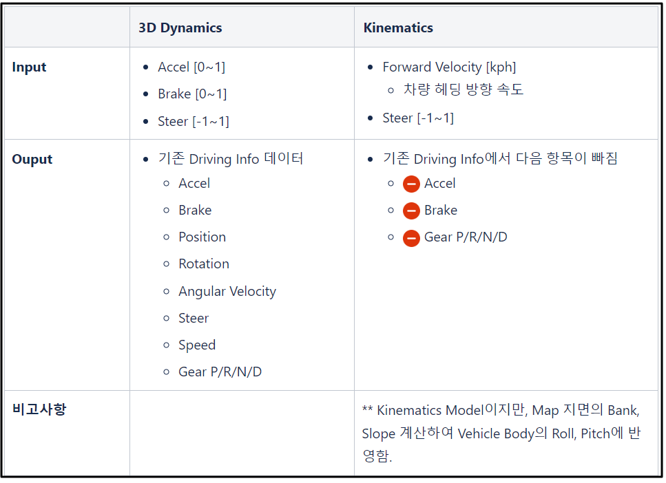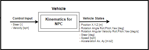 제한된 값 (Max Speed, Max Acc, Max Steer) 안에서 차량의 3D 모델을 움직여 User 가 원하는 Position 과 Velocity 를 구현하는 모델로, 별도의 구/제동 등 힘 계산은 없음