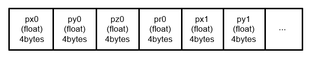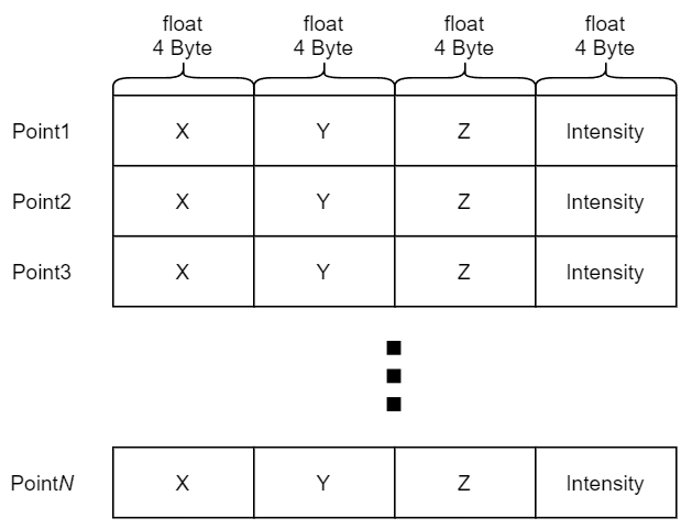 bin 파일 내 4 byte 씩 포인트 클라우드의 x, y, z, intensity 가 공백 없이 일렬로 저장되어 있음. 원점은 라이다를 마운트한 위치