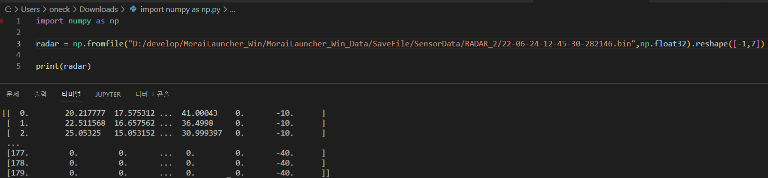 저장 위치는 SaveFile/SensorData/RADAR_* 이며, 파일 이름은 포인트 클라우드를 저장한 날짜와 시간으로 정해짐