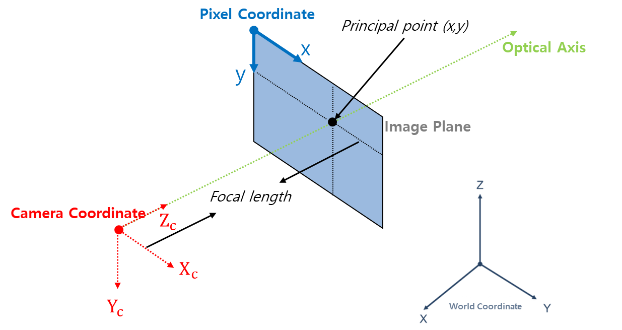 이 중 1개 point에 대한 Camera 좌표계는 Camera 가 바라보는 방향의 축을 Optical Axis 라고 할 때 아래의 (x, y, z) 로 구성된다.