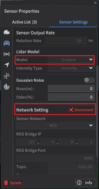 Custom Lidar 사용을 위해 ‘세팅 (Lidar.json 파일 추가)’ 및 '3D LiDAR Model > Custom 선택 '후 Network Setting Connect 시, 연결되지 않는 이슈 개선