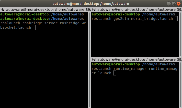$ terminator명령어를 입력해 terminator 터미널 창 생성$ roslaunch rosbridge_server rosbridge_websocket.launch$ roslaunch gps2utm morai_bridge.launch$ roslaunch runtime_manager runtime_manager.launch