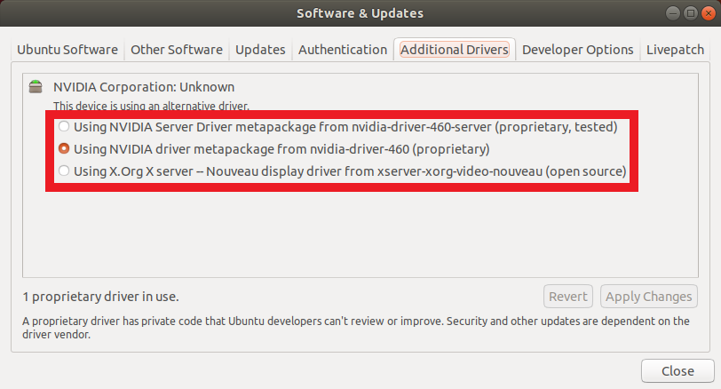 Nouveau 드라이버가 아닌 NVIDIA 드라이버를 활성화 한다.