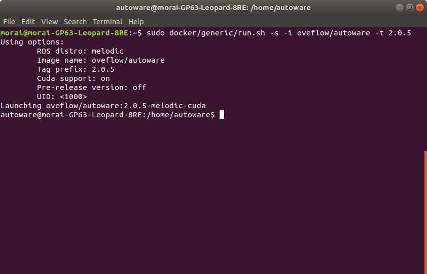 $ sudo docker/generic/run.sh -s -i oveflow/autoware -t 2.0.5