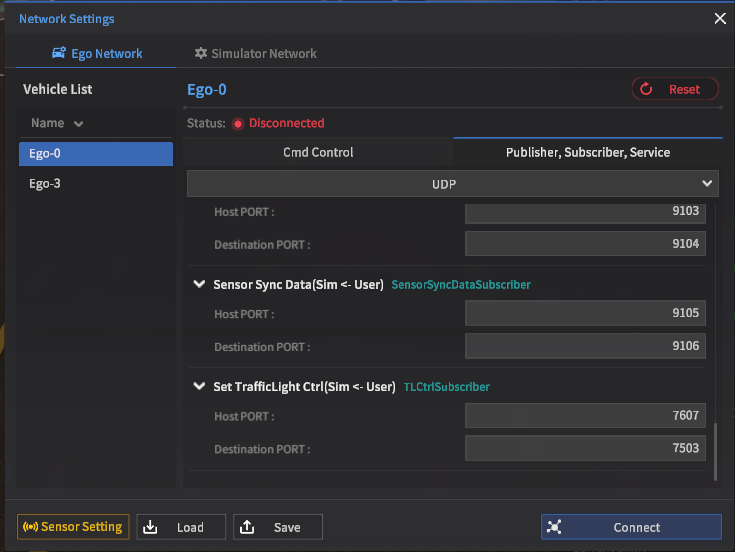 Network Settings 에서 제공하는 Ego Network 및 Simulator Network 에서 UDP 통신으로 주고받는 메시지 타입, 각 메시지의 패킷 구조 및 데이터 크기와 같은 세부 프로토콜 정보를 설명한다.