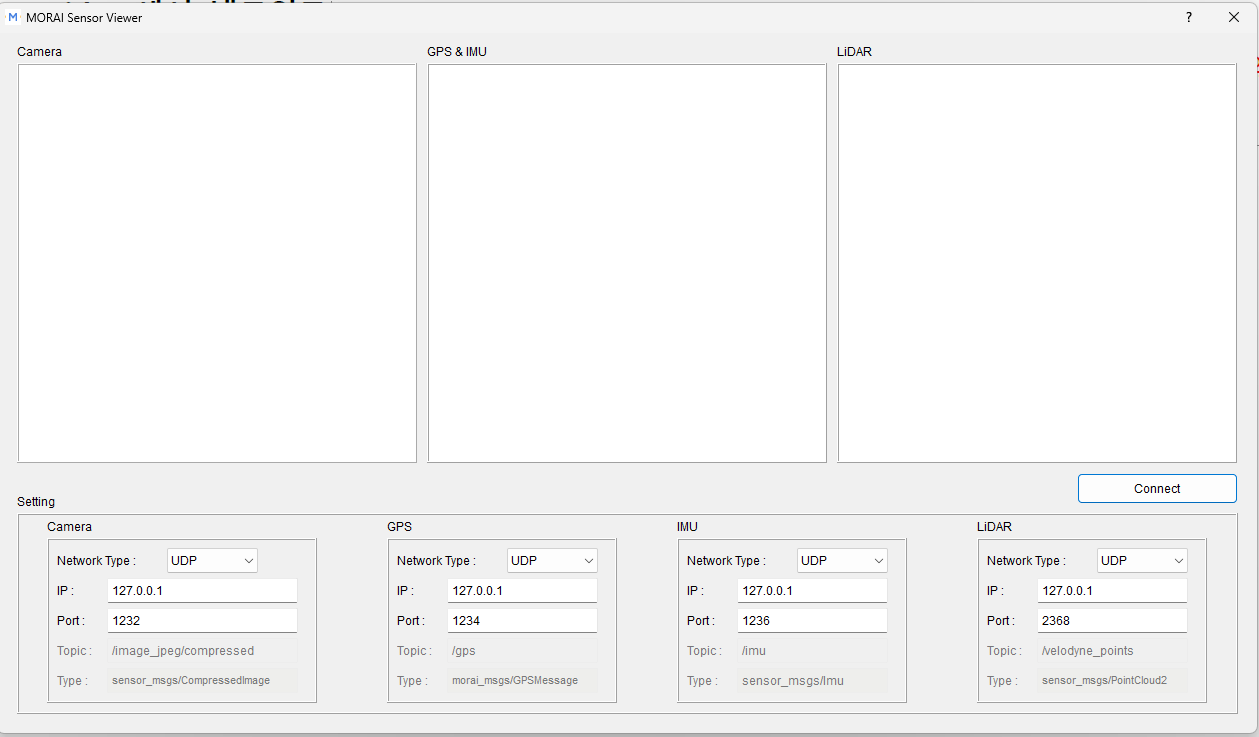 시뮬레이터의 각 센서의 네트워크를 아래와 같이 설정 후 Connect 클릭