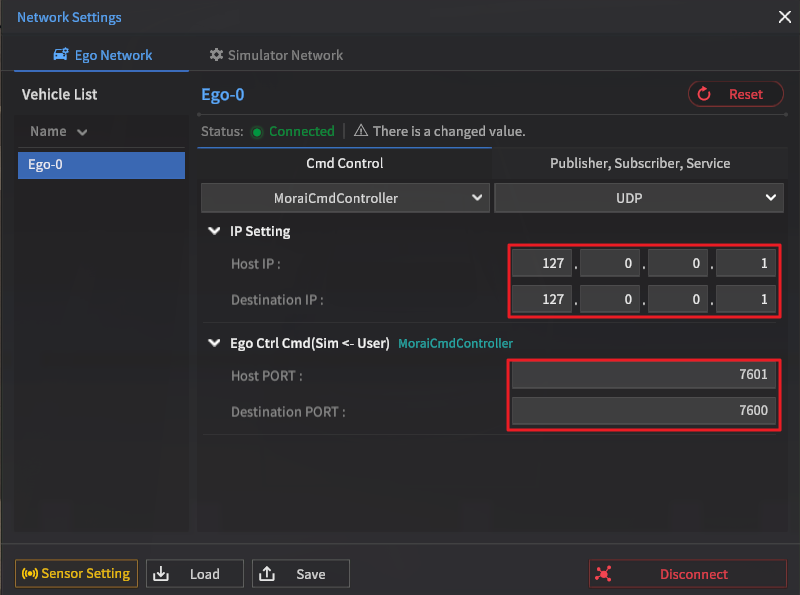 Simulator의 Edit > Network Setting 메뉴에서 해당 테스트 Scenario를 저장할 때 필요한 네트워크 정보를 아래와 같이 입력한다.