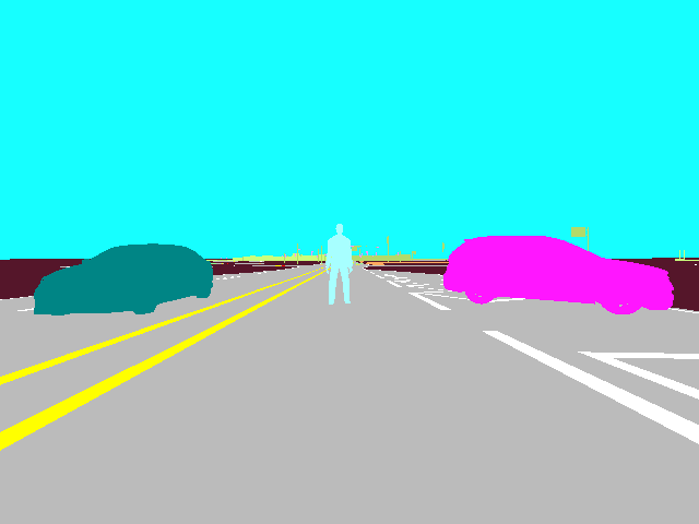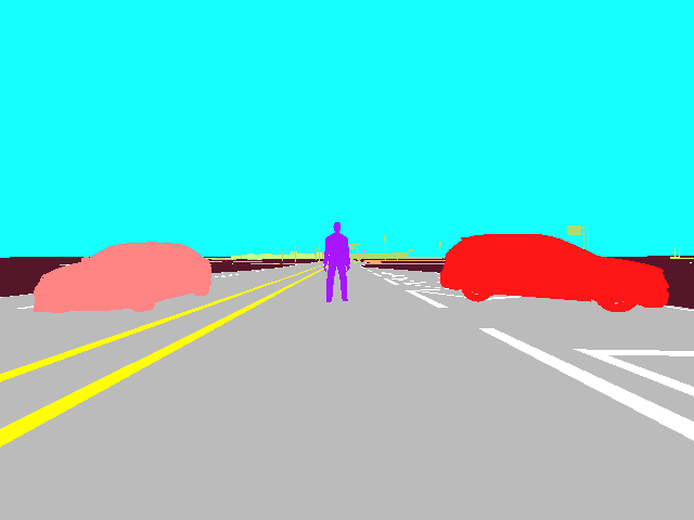 아래의 사진은 Camera 센서 세팅에서 Ground Truth 항목 ‘Segmantic’ 선택 후 센서 켭처 모드로 확인한 Semantic 사진 파일(.png)이다.