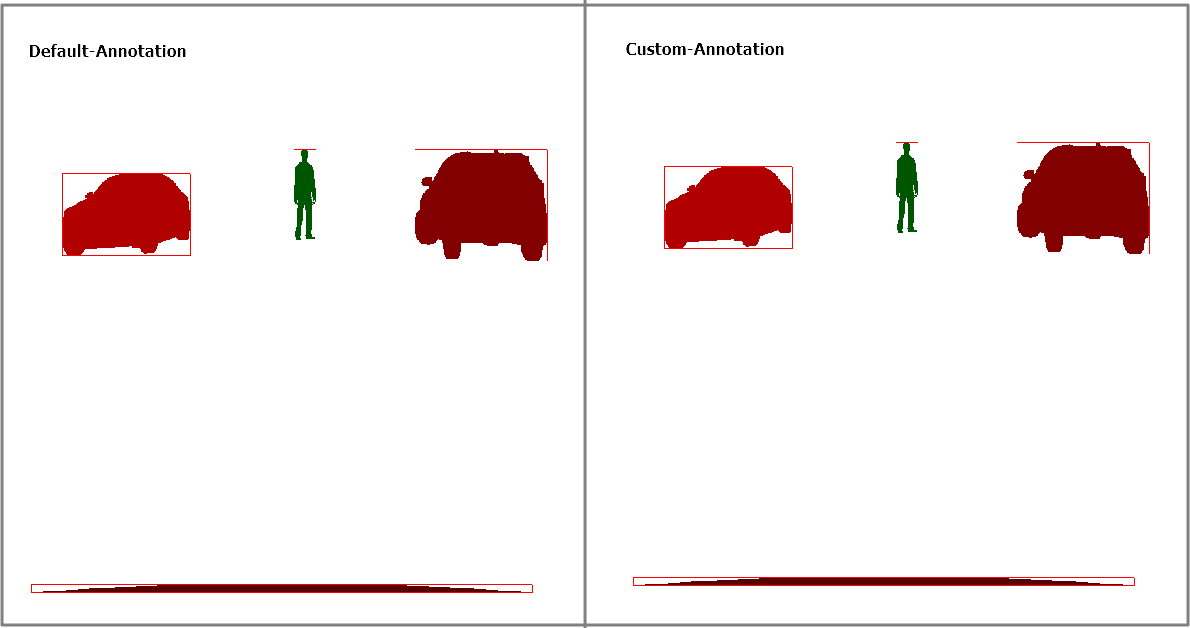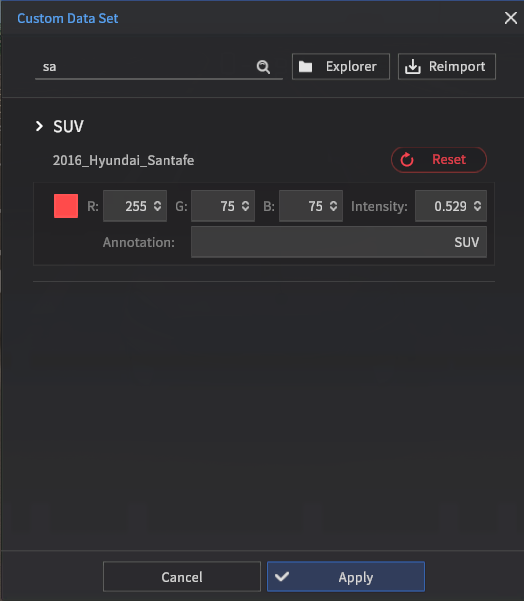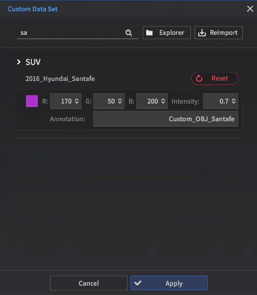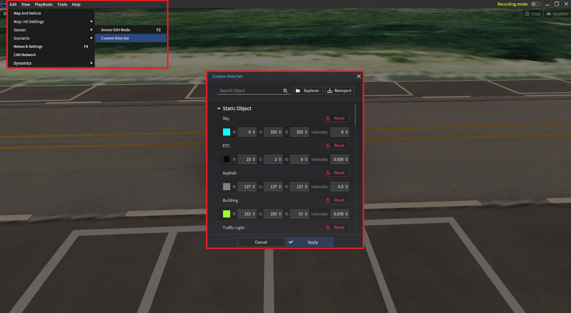 Custom Data Set 기능 진입 시 초기 설정된 값이 아닌 Static Object, Pedestrian, Vehicle 등 Object의 R,G,B,Intensity 값 및 Annotation 항목의 데이터를 수정하는 경우이다.