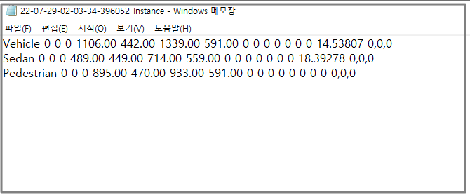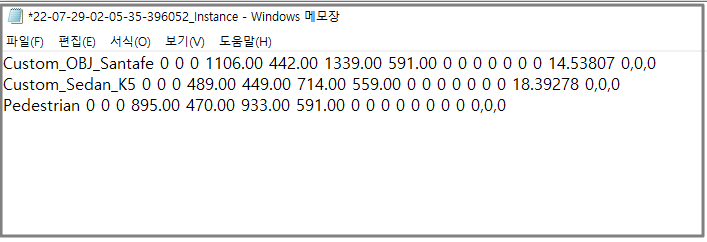 Camera 센서 세팅에서 Ground Truth 항목 ‘Instance’ 선택 후 센서 켭처 모드로 확인한 Instance 텍스트 파일(.txt)이다. 수정한 Annotation 데이터로 변경된 것을 확인할 수 있다.