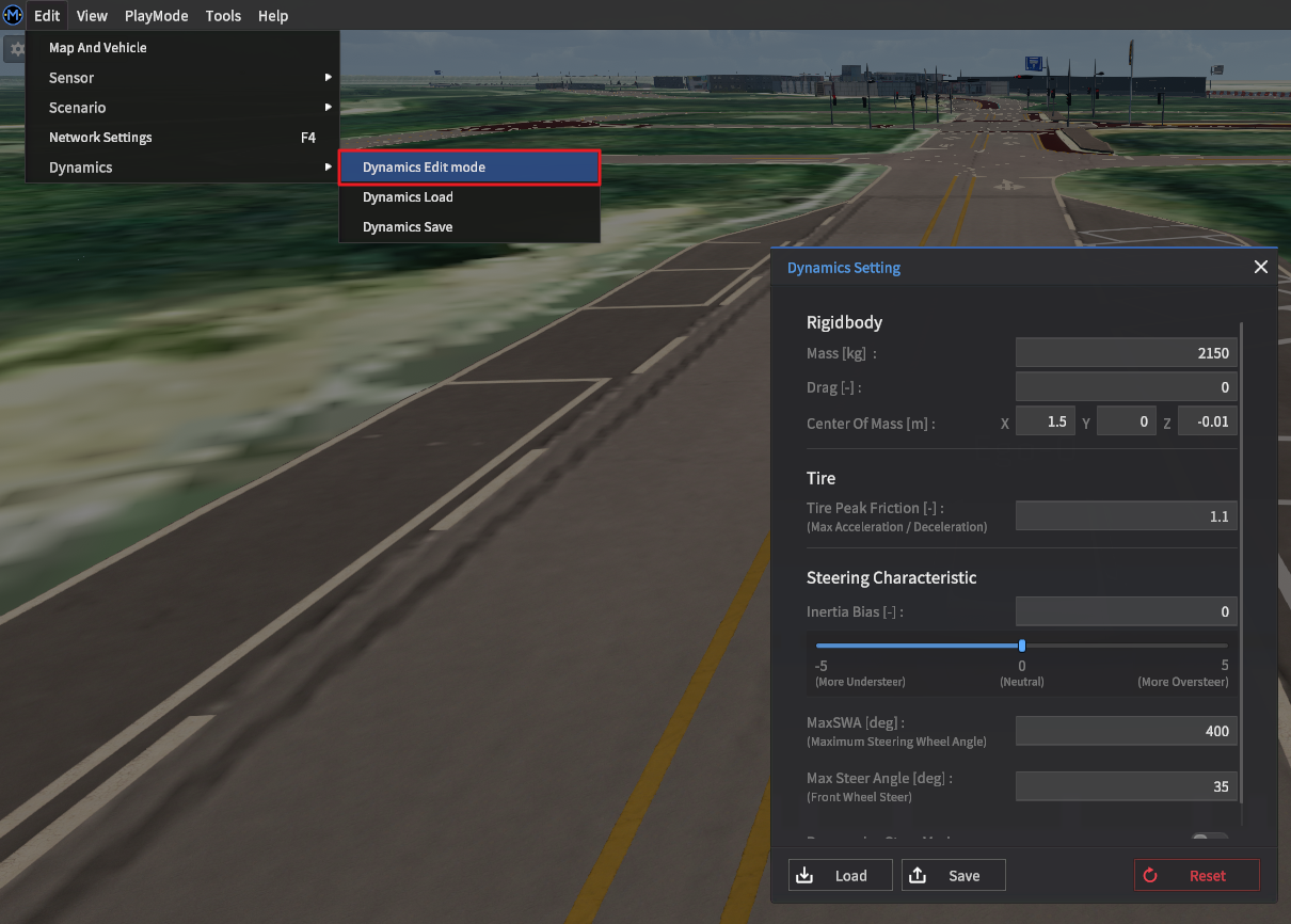 Vehicle Dynamics 변수 설정 가능한 기능으로 Edit > Dynamics > Dynamics Edit Mode에서 사용 가능.