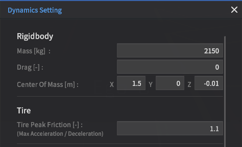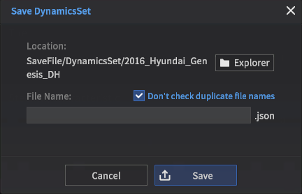 Dynamics Setting을 통해 설정한 차량 Dynamics Parameter를 파일(.json)로 저장 가능.