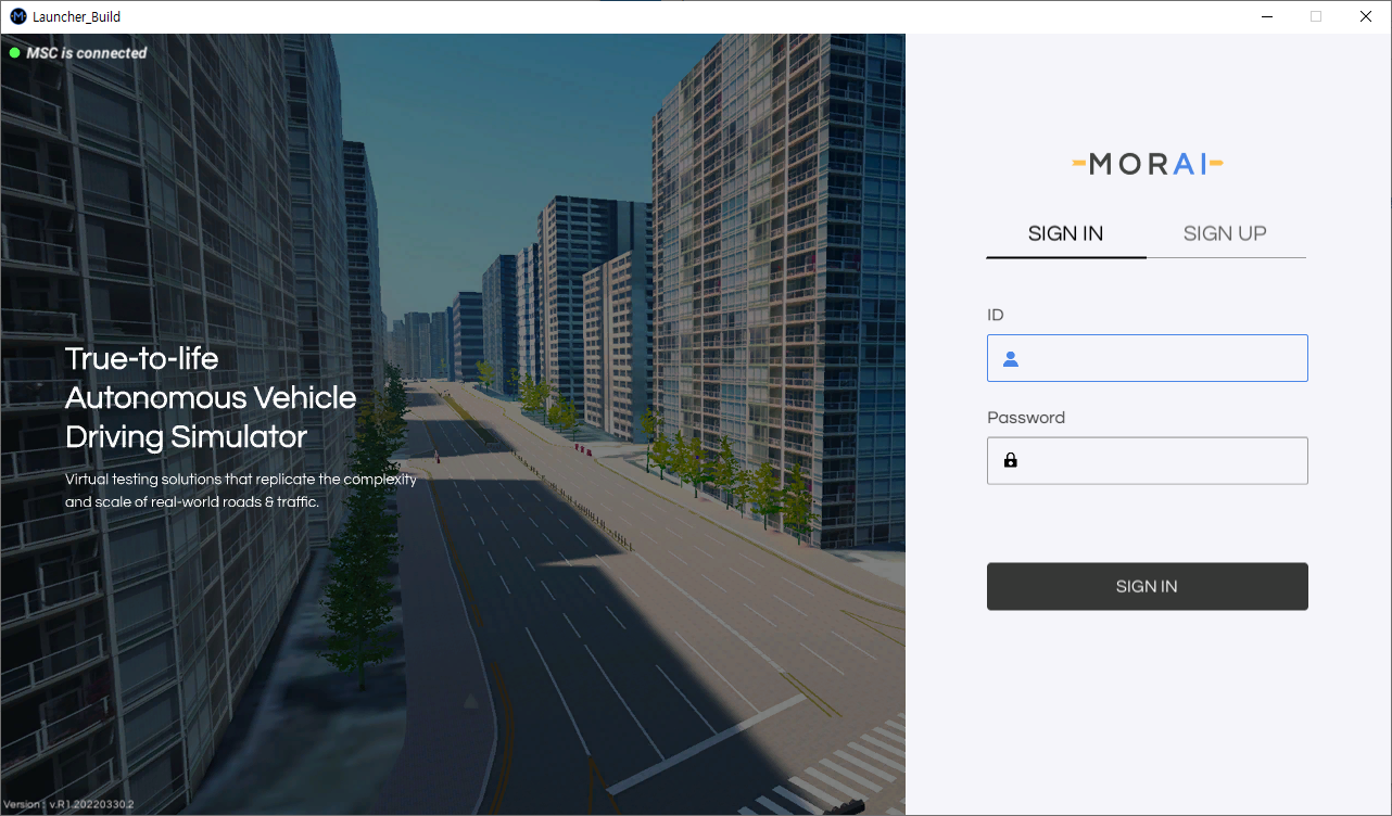 MORAI SIM: Drive 런처를 실행하고, 지급된 계정 정보를 입력하여 로그인 한다.