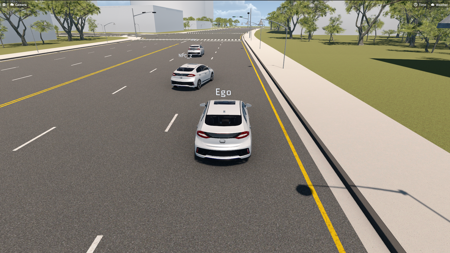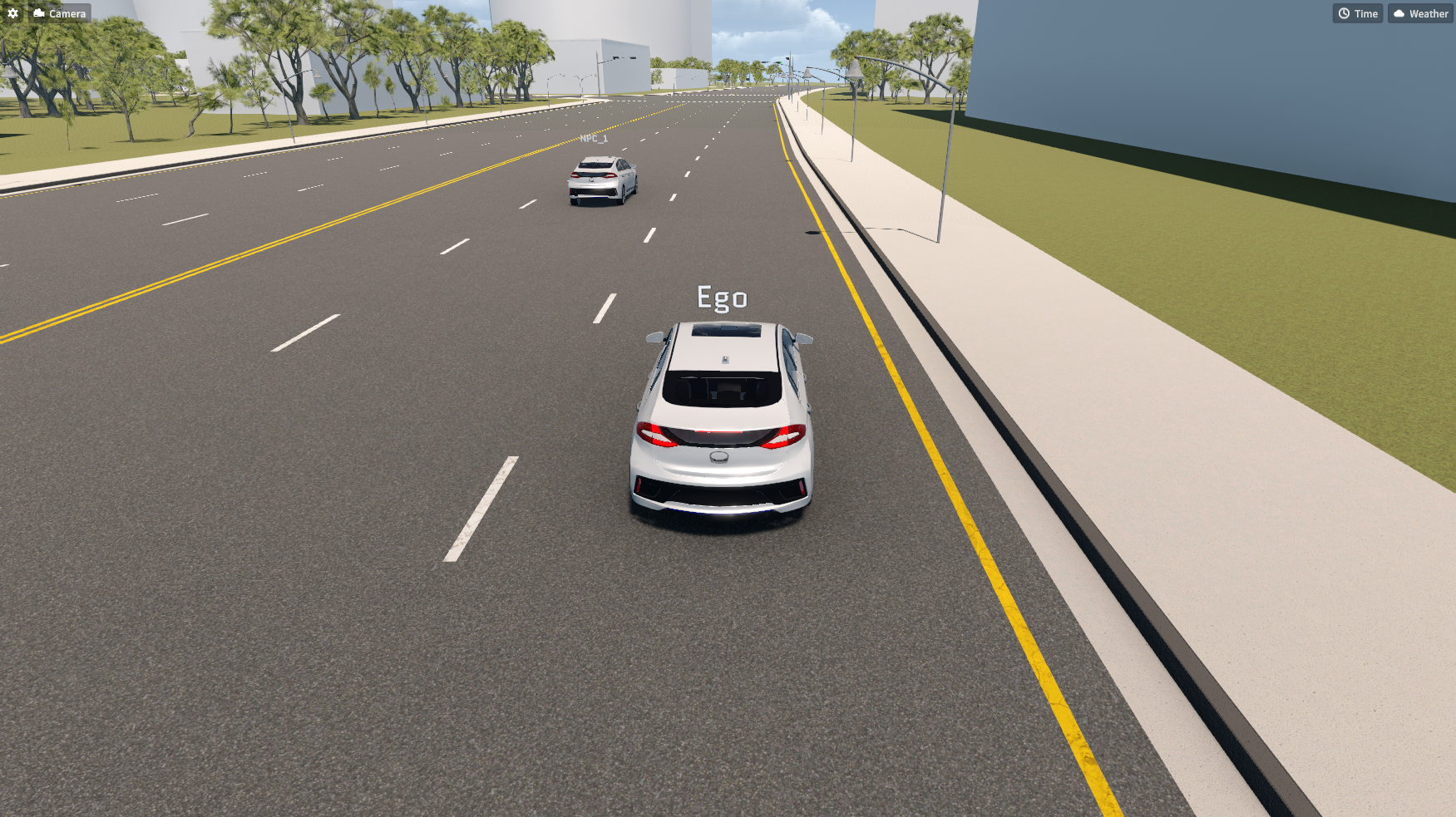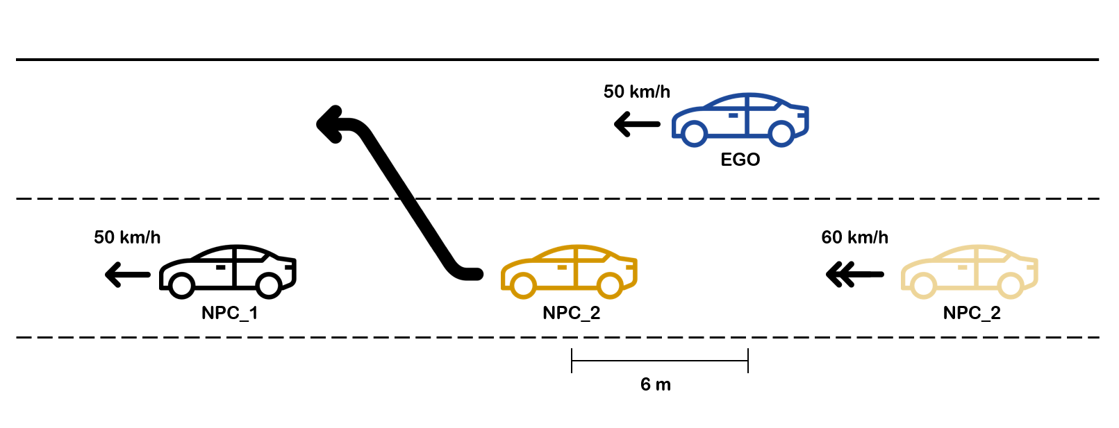 시나리오의 내용은 아래 그림과 같다. 초기 EGO 차량 및 NPC_1 차량은 50 km/h 의 속도로 주행하고 있으며, 뒤에서 주행하는 NPC_2 차량이 60 km/h의 속도로 EGO 차량을 추월한 뒤 차선을 변경한다.