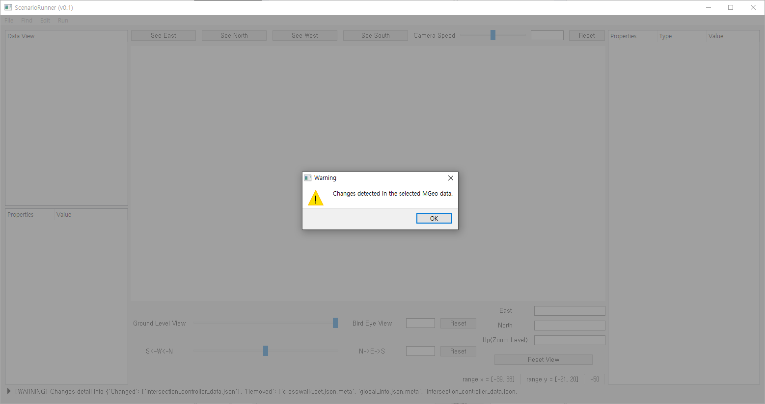 MGeo 데이터 변경 경고의 경우 시뮬레이션에 영향을 주지 않으므로 무시하여도 된다